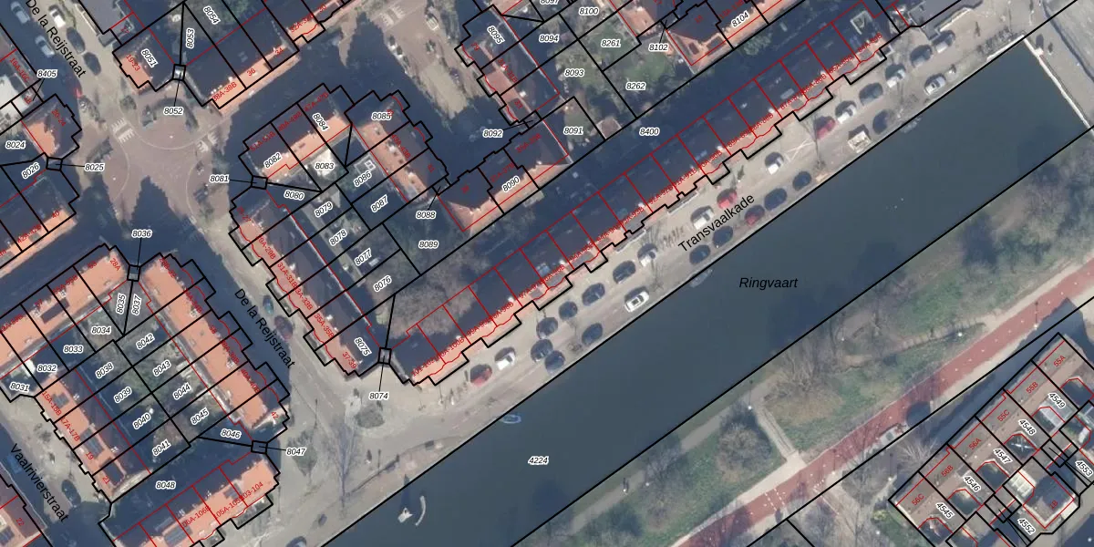 Transvaalkade 96-A is gelegen op kadastraal perceel ASD19W8400. Deze kadastrale aanduiding is uniek en wordt gebruikt door het Kadaster om eigendomsrechten en andere zakelijke rechten vast te leggen. Het perceel maakt onderdeel uit van de kadastrale gemeente Amsterdam.