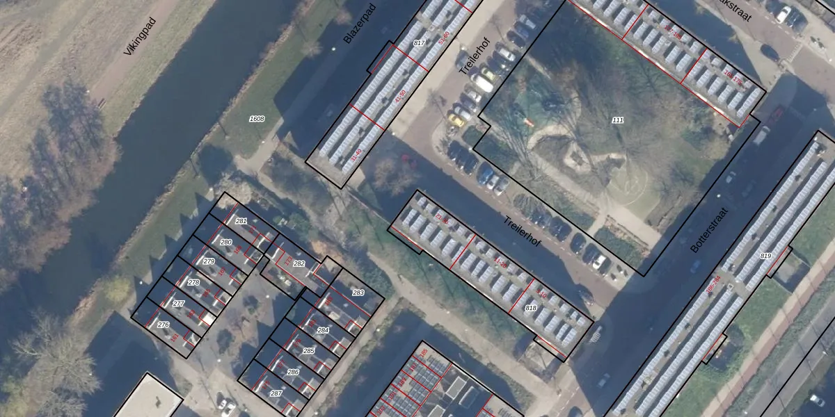 Het perceel waarop Treilerhof 30 staat heeft een oppervlakte van 595 m². Dit is een groot perceel. De perceeloppervlakte wordt geregistreerd door het Kadaster. Gedetailleerde informatie over de maten van dit perceel kunt u vinden in het rapport Kadastrale kaart met maatvoering van Treilerhof 30.