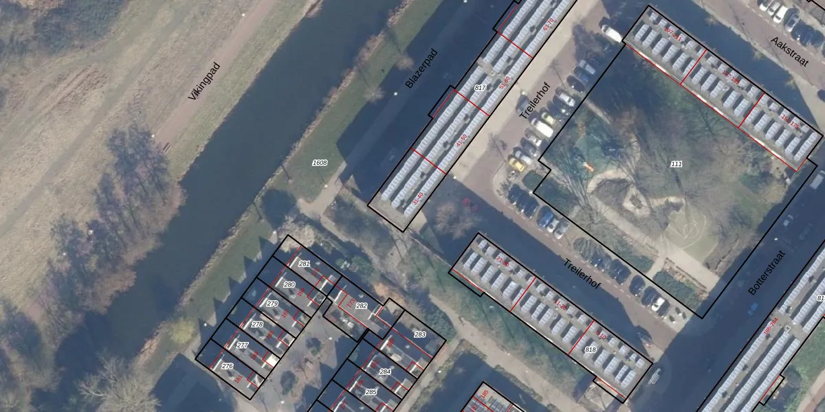 Het perceel waarop Treilerhof 32 staat heeft een oppervlakte van 973 m². Dit is een groot perceel. De perceeloppervlakte wordt geregistreerd door het Kadaster. Gedetailleerde informatie over de maten van dit perceel kunt u vinden in het rapport Kadastrale kaart met maatvoering van Treilerhof 32.