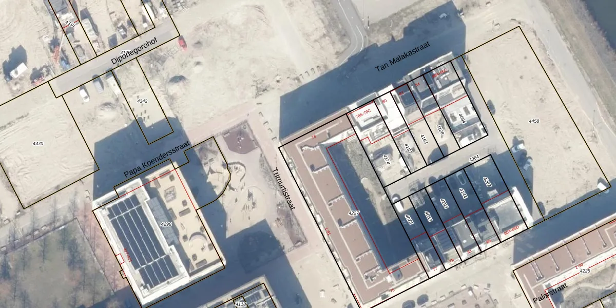 Het perceel waarop Trimurtistraat 63 staat heeft een oppervlakte van 1470 m². Dit is een zeer groot perceel. De perceeloppervlakte wordt geregistreerd door het Kadaster. Gedetailleerde informatie over de maten van dit perceel kunt u vinden in het rapport Kadastrale kaart met maatvoering van Trimurtistraat 63.