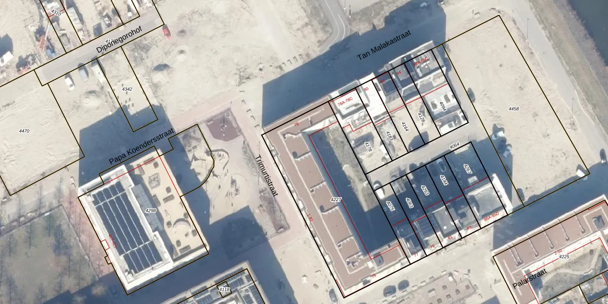 Het perceel waarop Trimurtistraat 65 staat heeft een oppervlakte van 1470 m². Dit is een zeer groot perceel. De perceeloppervlakte wordt geregistreerd door het Kadaster. Gedetailleerde informatie over de maten van dit perceel kunt u vinden in het rapport Kadastrale kaart met maatvoering van Trimurtistraat 65.