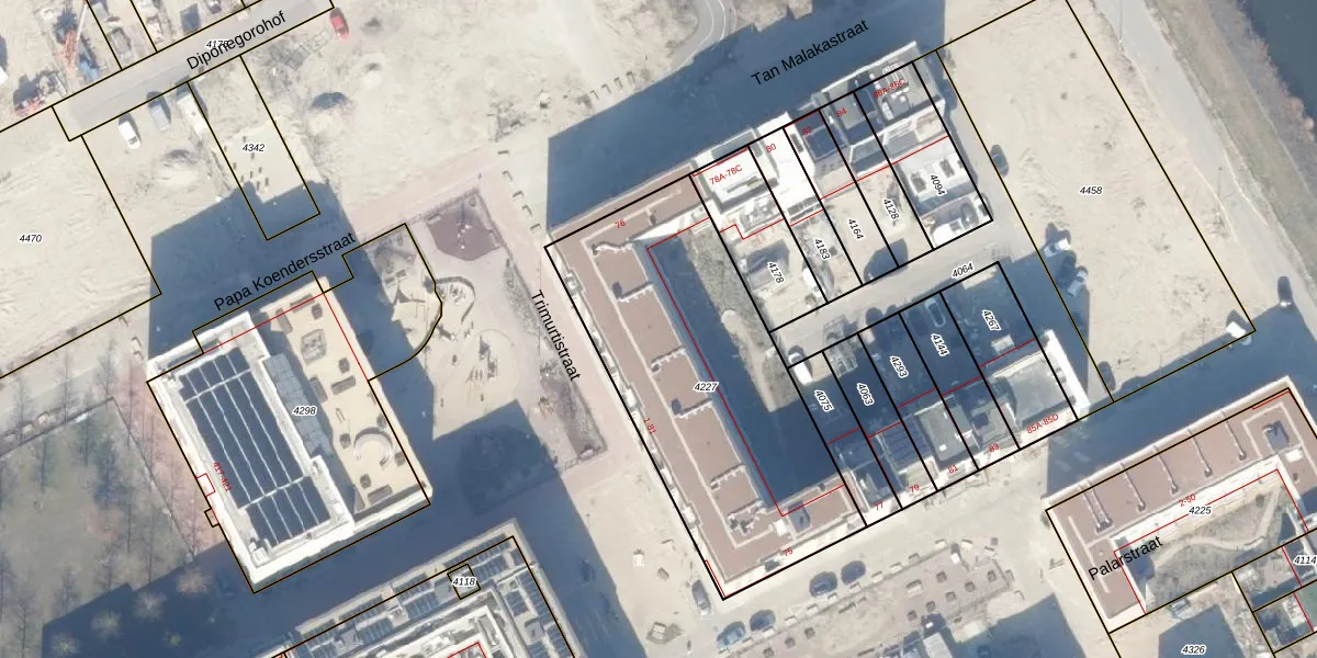 Het perceel waarop Trimurtistraat 69 staat heeft een oppervlakte van 1470 m². Dit is een zeer groot perceel. De perceeloppervlakte wordt geregistreerd door het Kadaster. Gedetailleerde informatie over de maten van dit perceel kunt u vinden in het rapport Kadastrale kaart met maatvoering van Trimurtistraat 69.
