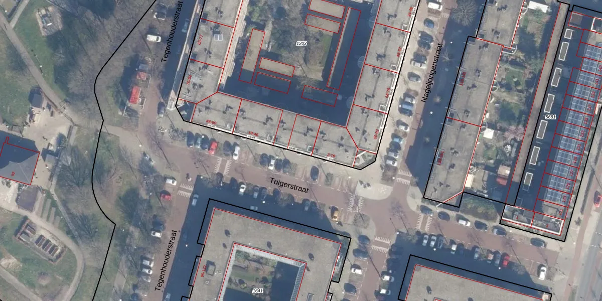 Het perceel waarop Tuigerstraat 24 staat heeft een oppervlakte van 4695 m². Dit is een zeer groot perceel. De perceeloppervlakte wordt geregistreerd door het Kadaster. Gedetailleerde informatie over de maten van dit perceel kunt u vinden in het rapport Kadastrale kaart met maatvoering van Tuigerstraat 24.