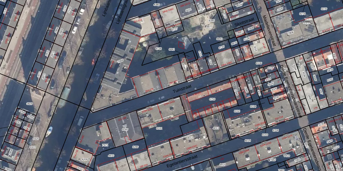Het adres is gelegen op perceel 7968 in de sectie L en de kadastrale gemeente Amsterdam. De kadastrale aanduiding is aldus ASD08-L-7968. De oppervlakte van het perceel is 1544 m². Dat is groter dan gemiddeld in Amsterdam, waar de gemiddelde perceeloppervlakte op 202,23 m² ligt. Het grootste perceel in de kadastrale gemeente is 3,3 ha. Het kleinste perceel heeft een oppervlakte van 0 m². Op het perceel liggen in totaal 48 adressen. De huidige grenzen van het perceel zijn digitaal in de Basisregistratie Kadaster (BRK) geregistreerd op 31-01-2007.