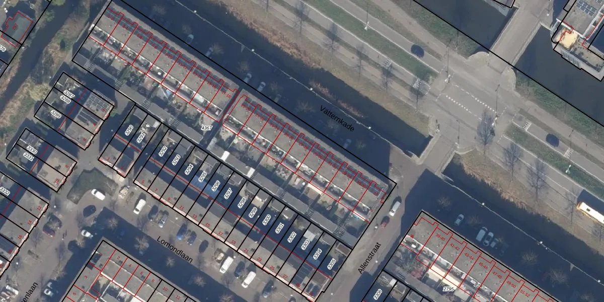 Het perceel waarop Vätternkade 28 staat heeft een oppervlakte van 2932 m². Dit is een zeer groot perceel. De perceeloppervlakte wordt geregistreerd door het Kadaster. Gedetailleerde informatie over de maten van dit perceel kunt u vinden in het rapport Kadastrale kaart met maatvoering van Vätternkade 28.
