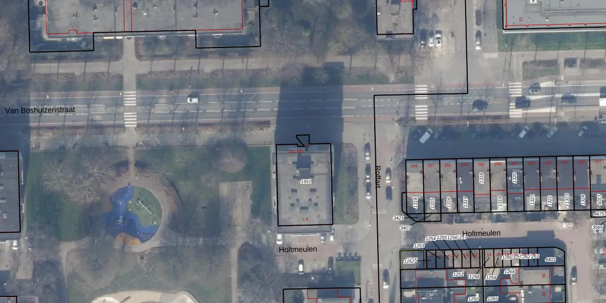 Het perceel waarop Van Boshuizenstraat 261 staat heeft een oppervlakte van 491 m². Dit is een groot perceel. De perceeloppervlakte wordt geregistreerd door het Kadaster. Gedetailleerde informatie over de maten van dit perceel kunt u vinden in het rapport Kadastrale kaart met maatvoering van Van Boshuizenstraat 261.