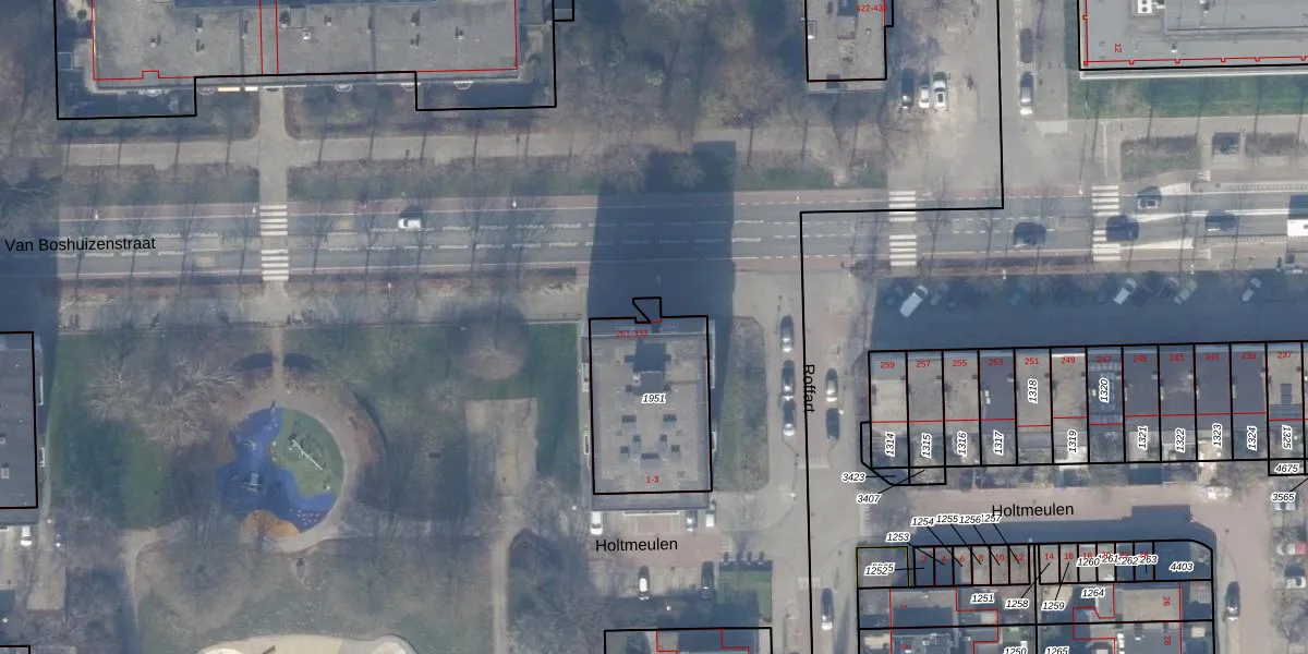 Het perceel waarop Van Boshuizenstraat 263 staat heeft een oppervlakte van 491 m². Dit is een groot perceel. De perceeloppervlakte wordt geregistreerd door het Kadaster. Gedetailleerde informatie over de maten van dit perceel kunt u vinden in het rapport Kadastrale kaart met maatvoering van Van Boshuizenstraat 263.