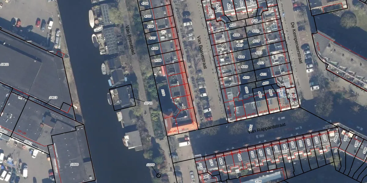 Van Bossestraat 106-A is gelegen op kadastraal perceel ASD21Y2376. Deze kadastrale aanduiding is uniek en wordt gebruikt door het Kadaster om eigendomsrechten en andere zakelijke rechten vast te leggen. Het perceel maakt onderdeel uit van de kadastrale gemeente Amsterdam.