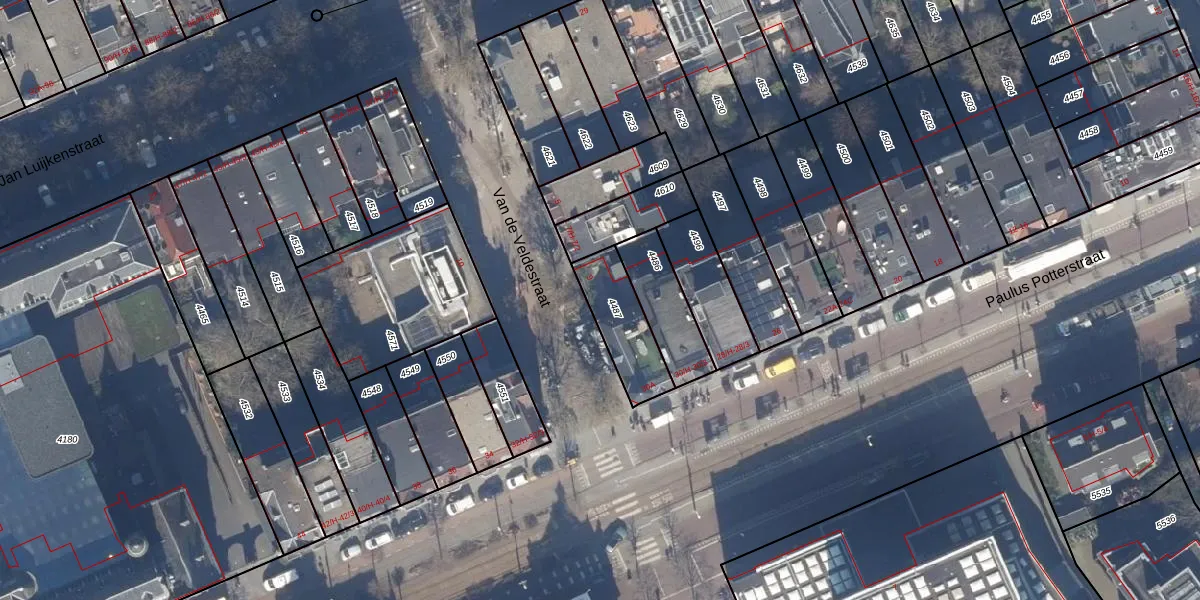 Van de Veldestraat 9 is gelegen op kadastraal perceel ASD14R4487. Deze kadastrale aanduiding is uniek en wordt gebruikt door het Kadaster om eigendomsrechten en andere zakelijke rechten vast te leggen. Het perceel maakt onderdeel uit van de kadastrale gemeente Amsterdam.