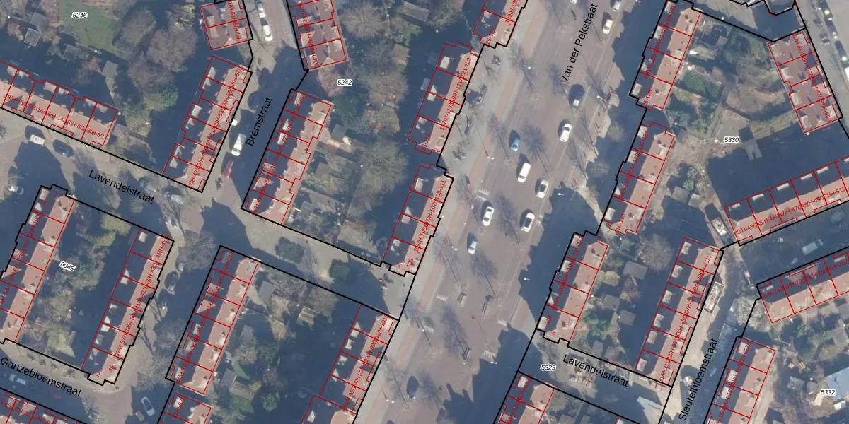 Het perceel waarop Van der Pekstraat 107-1 staat heeft een oppervlakte van 3990 m². Dit is een zeer groot perceel. De perceeloppervlakte wordt geregistreerd door het Kadaster. Gedetailleerde informatie over de maten van dit perceel kunt u vinden in het rapport Kadastrale kaart met maatvoering van Van der Pekstraat 107-1.