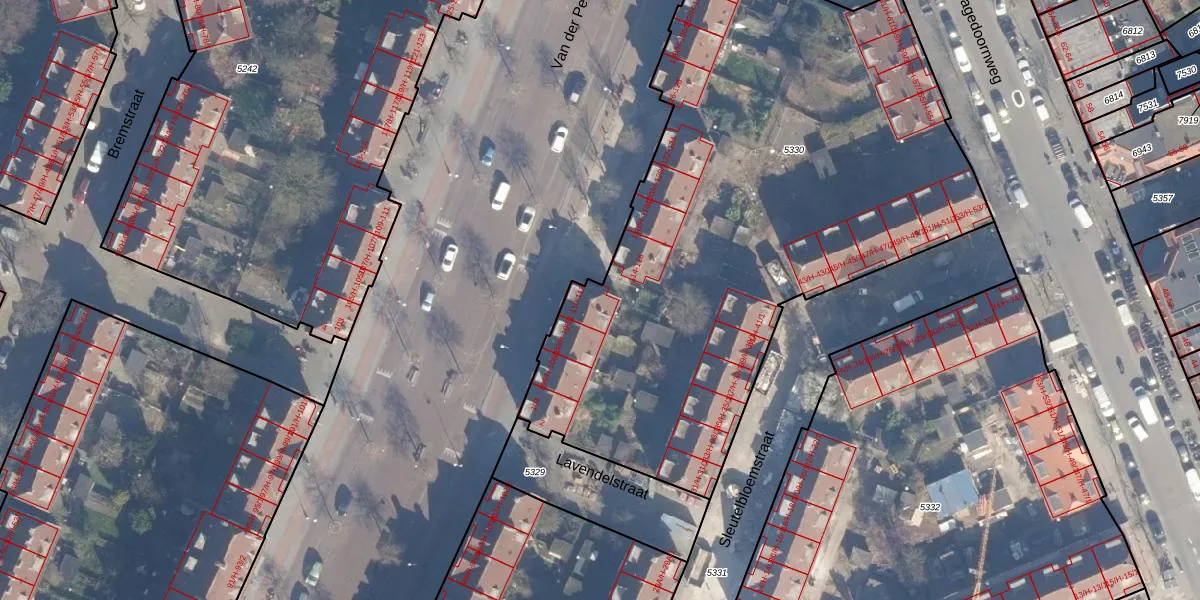 Het perceel waarop Van der Pekstraat 112 staat heeft een oppervlakte van 3526 m². Dit is een zeer groot perceel. De perceeloppervlakte wordt geregistreerd door het Kadaster. Gedetailleerde informatie over de maten van dit perceel kunt u vinden in het rapport Kadastrale kaart met maatvoering van Van der Pekstraat 112.