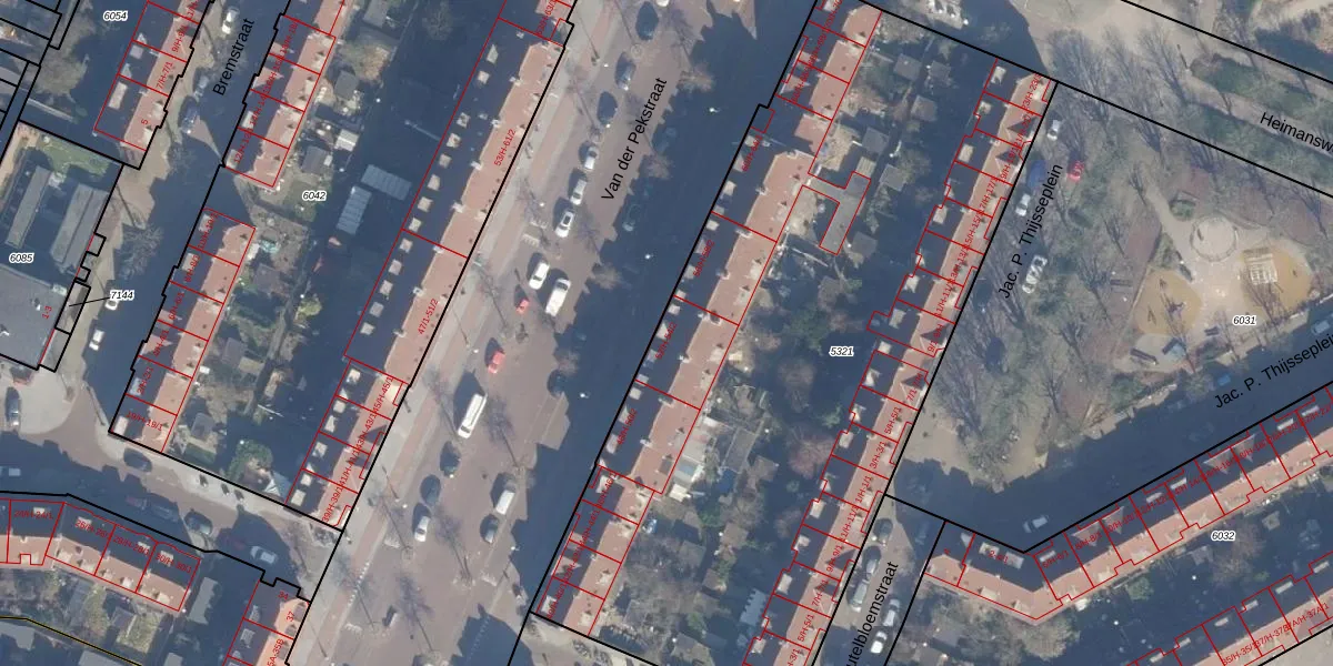 Het perceel waarop Van der Pekstraat 54-H staat heeft een oppervlakte van 4225 m². Dit is een zeer groot perceel. De perceeloppervlakte wordt geregistreerd door het Kadaster. Gedetailleerde informatie over de maten van dit perceel kunt u vinden in het rapport Kadastrale kaart met maatvoering van Van der Pekstraat 54-H.