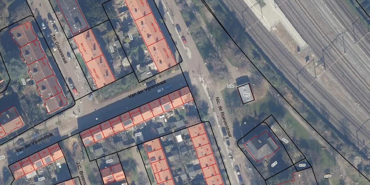 Het perceel waarop Van der Vijverstraat 1 staat heeft een oppervlakte van 1218 m². Dit is een zeer groot perceel. De perceeloppervlakte wordt geregistreerd door het Kadaster. Gedetailleerde informatie over de maten van dit perceel kunt u vinden in het rapport Kadastrale kaart met maatvoering van Van der Vijverstraat 1.