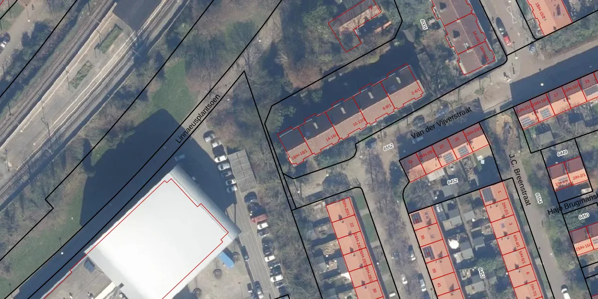 Het perceel waarop Van der Vijverstraat 18-H staat heeft een oppervlakte van 2857 m². Dit is een zeer groot perceel. De perceeloppervlakte wordt geregistreerd door het Kadaster. Gedetailleerde informatie over de maten van dit perceel kunt u vinden in het rapport Kadastrale kaart met maatvoering van Van der Vijverstraat 18-H.