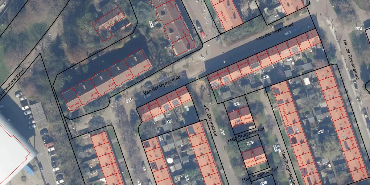 Het perceel waarop Van der Vijverstraat 23-H staat heeft een oppervlakte van 610 m². Dit is een groot perceel. De perceeloppervlakte wordt geregistreerd door het Kadaster. Gedetailleerde informatie over de maten van dit perceel kunt u vinden in het rapport Kadastrale kaart met maatvoering van Van der Vijverstraat 23-H.
