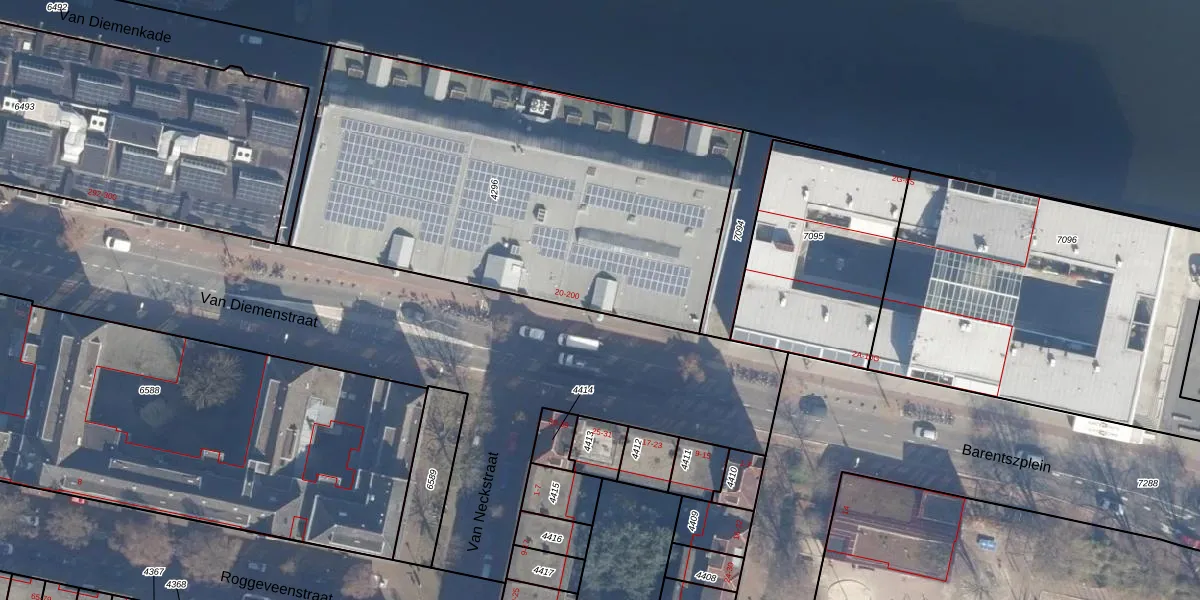 Het perceel waarop Van Diemenstraat 162 staat heeft een oppervlakte van 2409 m². Dit is een zeer groot perceel. De perceeloppervlakte wordt geregistreerd door het Kadaster. Gedetailleerde informatie over de maten van dit perceel kunt u vinden in het rapport Kadastrale kaart met maatvoering van Van Diemenstraat 162.