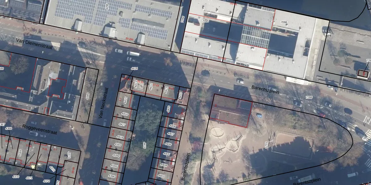 Het perceel waarop Van Diemenstraat 7 staat heeft een oppervlakte van 60 m². Dit is een klein perceel. De perceeloppervlakte wordt geregistreerd door het Kadaster. Gedetailleerde informatie over de maten van dit perceel kunt u vinden in het rapport Kadastrale kaart met maatvoering van Van Diemenstraat 7.