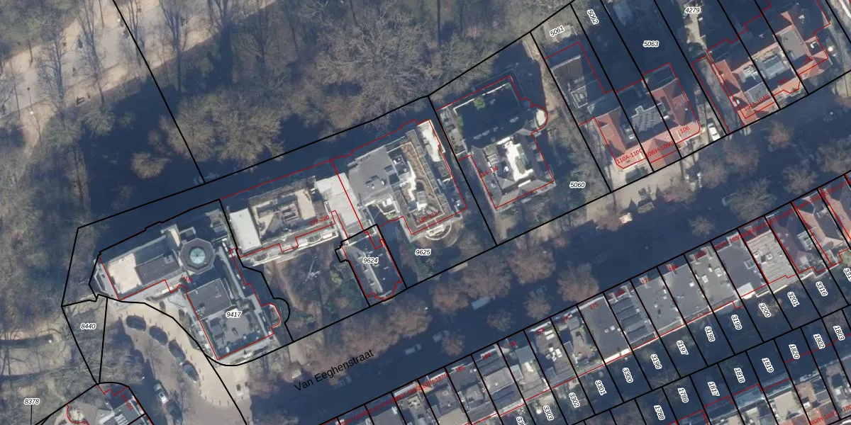 Het perceel waarop Van Eeghenstraat 188 staat heeft een oppervlakte van 2290 m². Dit is een zeer groot perceel. De perceeloppervlakte wordt geregistreerd door het Kadaster. Gedetailleerde informatie over de maten van dit perceel kunt u vinden in het rapport Kadastrale kaart met maatvoering van Van Eeghenstraat 188.