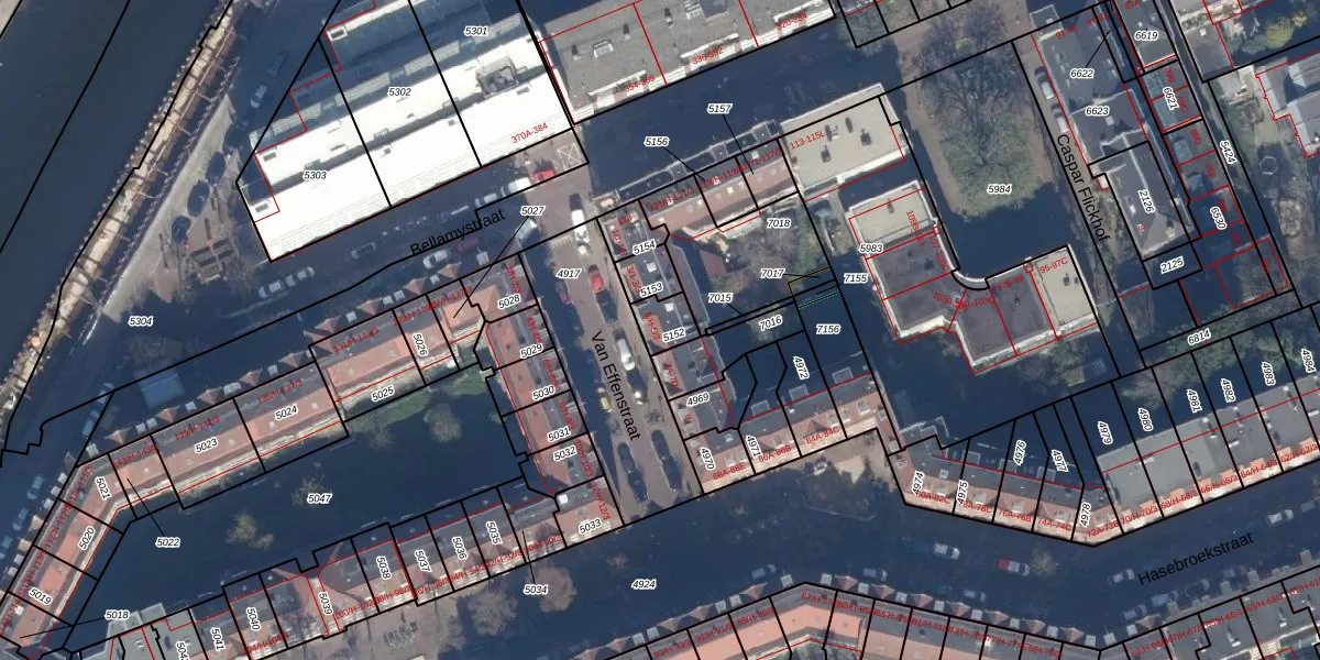 Het adres is gelegen op perceel 5152 in de sectie T en de kadastrale gemeente Amsterdam. De kadastrale aanduiding is aldus ASD16-T-5152. Het perceel is kleiner dan gemiddeld in Amsterdam. Het perceel is 69 m² groot, terwijl het gemiddelde ligt op 245,33 m². De grootste perceeloppervlakte in de kadastrale gemeente is 3,3 ha. De kleinste oppervlakte bedraagt 0 m². Op het perceel liggen in totaal 4 adressen. De huidige grenzen van het perceel zijn digitaal in de Basisregistratie Kadaster (BRK) geregistreerd op 12-01-2007.