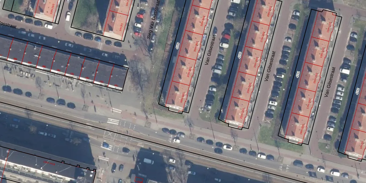 Het perceel waarop Van Gilsestraat 39-2 staat heeft een oppervlakte van 1258 m². Dit is een zeer groot perceel. De perceeloppervlakte wordt geregistreerd door het Kadaster. Gedetailleerde informatie over de maten van dit perceel kunt u vinden in het rapport Kadastrale kaart met maatvoering van Van Gilsestraat 39-2.