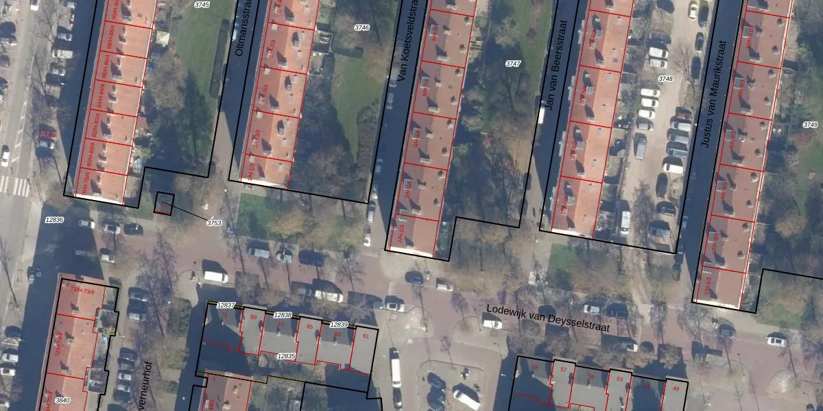 Het perceel waarop Van Koetsveldstraat 2-H staat heeft een oppervlakte van 2615 m². Dit is een zeer groot perceel. De perceeloppervlakte wordt geregistreerd door het Kadaster. Gedetailleerde informatie over de maten van dit perceel kunt u vinden in het rapport Kadastrale kaart met maatvoering van Van Koetsveldstraat 2-H.