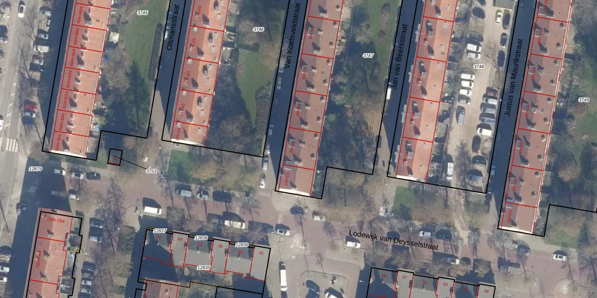 Het perceel waarop Van Koetsveldstraat 2-4 staat heeft een oppervlakte van 2615 m². Dit is een zeer groot perceel. De perceeloppervlakte wordt geregistreerd door het Kadaster. Gedetailleerde informatie over de maten van dit perceel kunt u vinden in het rapport Kadastrale kaart met maatvoering van Van Koetsveldstraat 2-4.
