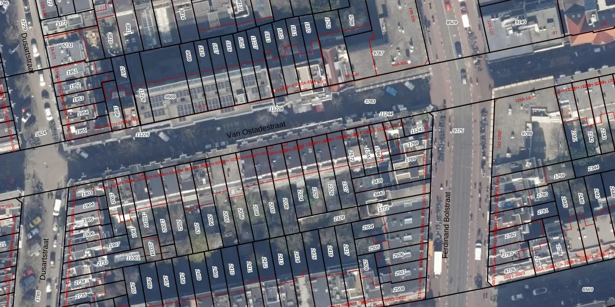 Van Ostadestraat 102-3 is gelegen op kadastraal perceel ASD18V2325. Deze kadastrale aanduiding is uniek en wordt gebruikt door het Kadaster om eigendomsrechten en andere zakelijke rechten vast te leggen. Het perceel maakt onderdeel uit van de kadastrale gemeente Amsterdam.