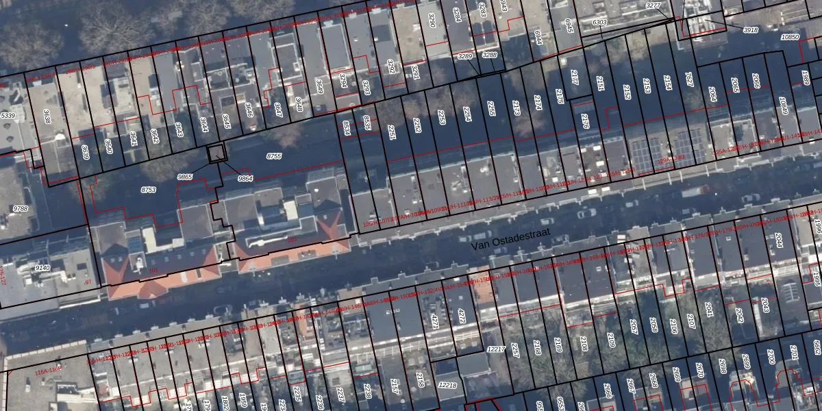 Van Ostadestraat 107-A-H is gelegen op kadastraal perceel ASD18V2251. Deze kadastrale aanduiding is uniek en wordt gebruikt door het Kadaster om eigendomsrechten en andere zakelijke rechten vast te leggen. Het perceel maakt onderdeel uit van de kadastrale gemeente Amsterdam.