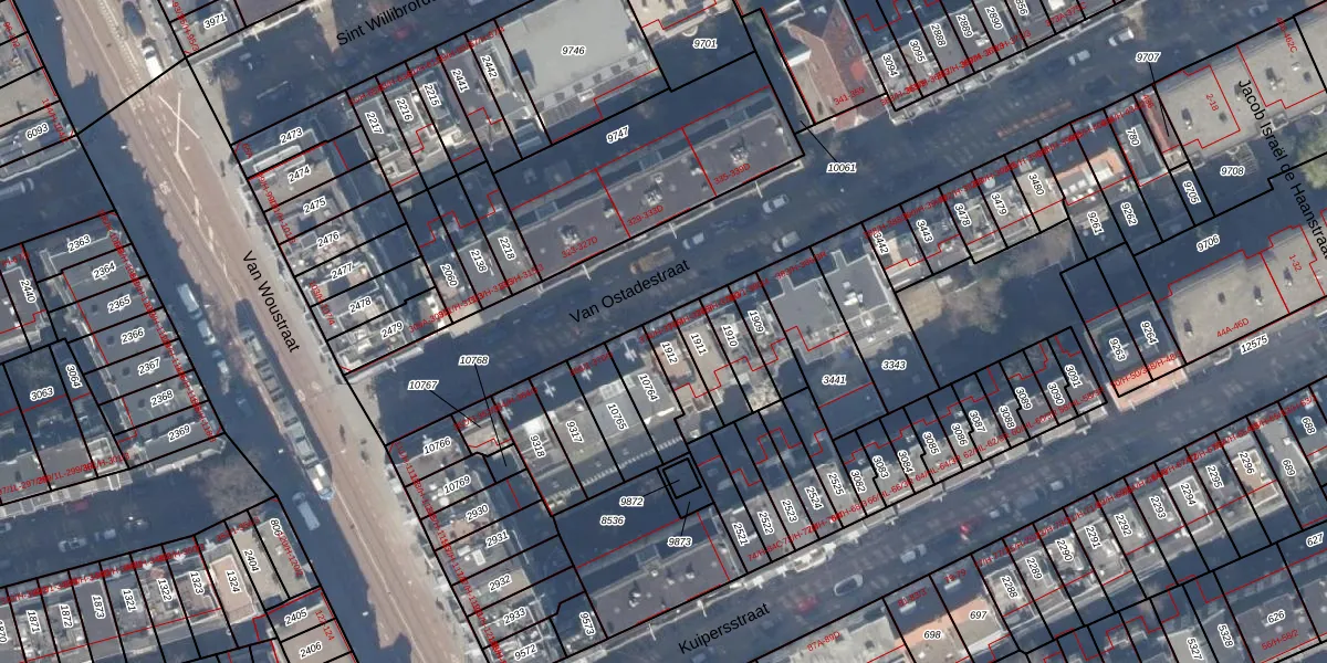 Het perceel waarop Van Ostadestraat 374-H staat heeft een oppervlakte van 95 m². Dit is een klein perceel. De perceeloppervlakte wordt geregistreerd door het Kadaster. Gedetailleerde informatie over de maten van dit perceel kunt u vinden in het rapport Kadastrale kaart met maatvoering van Van Ostadestraat 374-H.