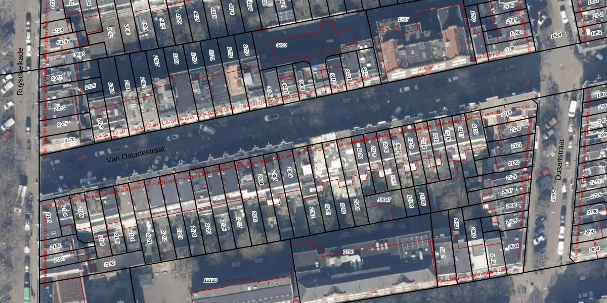 Van Ostadestraat 40-A is gelegen op kadastraal perceel ASD18V2261. Deze kadastrale aanduiding is uniek en wordt gebruikt door het Kadaster om eigendomsrechten en andere zakelijke rechten vast te leggen. Het perceel maakt onderdeel uit van de kadastrale gemeente Amsterdam.