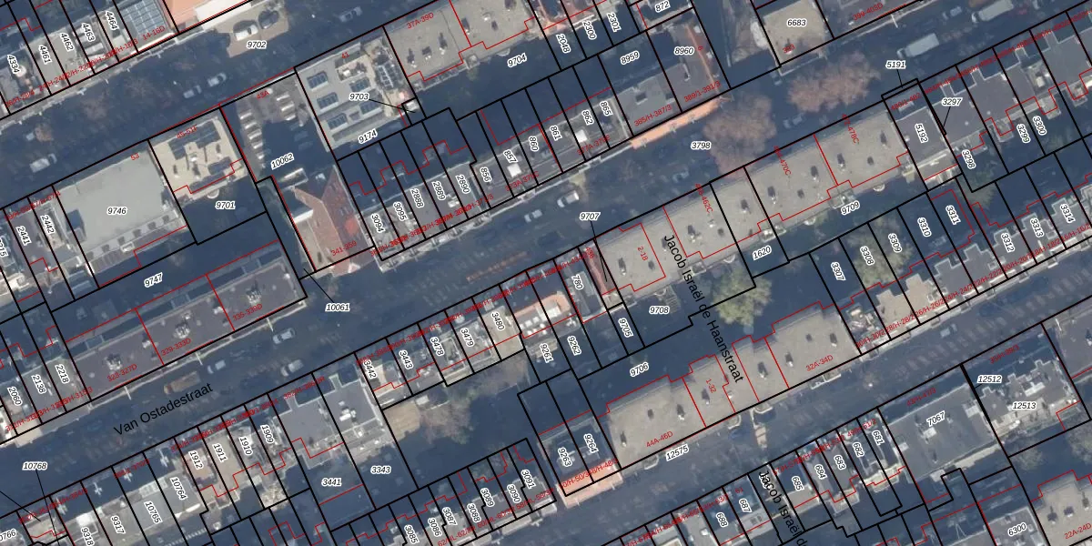 Van Ostadestraat 400-1 is gelegen op kadastraal perceel ASD18V9262. Deze kadastrale aanduiding is uniek en wordt gebruikt door het Kadaster om eigendomsrechten en andere zakelijke rechten vast te leggen. Het perceel maakt onderdeel uit van de kadastrale gemeente Amsterdam.