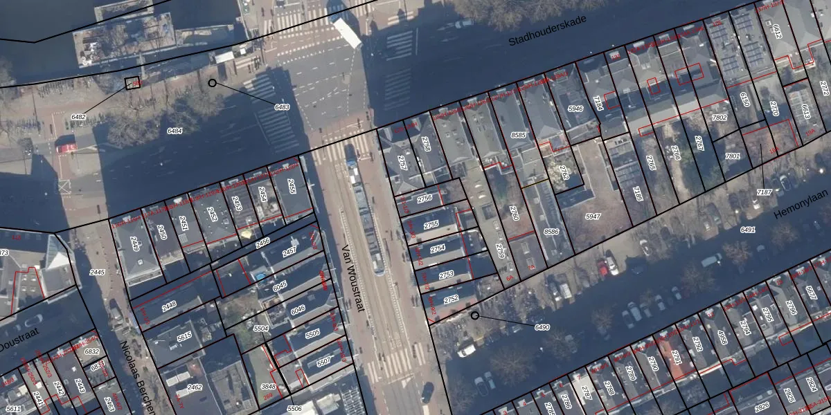Het perceel waarop Van Woustraat 1-3 staat heeft een oppervlakte van 84 m². Dit is een klein perceel. De perceeloppervlakte wordt geregistreerd door het Kadaster. Gedetailleerde informatie over de maten van dit perceel kunt u vinden in het rapport Kadastrale kaart met maatvoering van Van Woustraat 1-3.