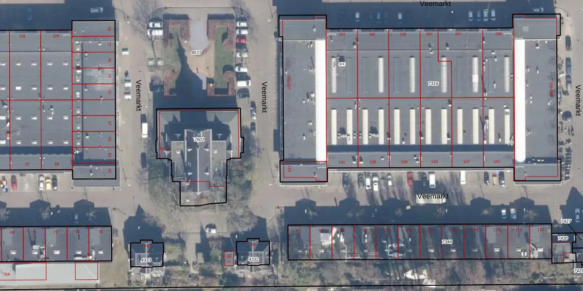 Het perceel waarop Veemarkt 115 staat heeft een oppervlakte van 4822 m². Dit is een zeer groot perceel. De perceeloppervlakte wordt geregistreerd door het Kadaster. Gedetailleerde informatie over de maten van dit perceel kunt u vinden in het rapport Kadastrale kaart met maatvoering van Veemarkt 115.