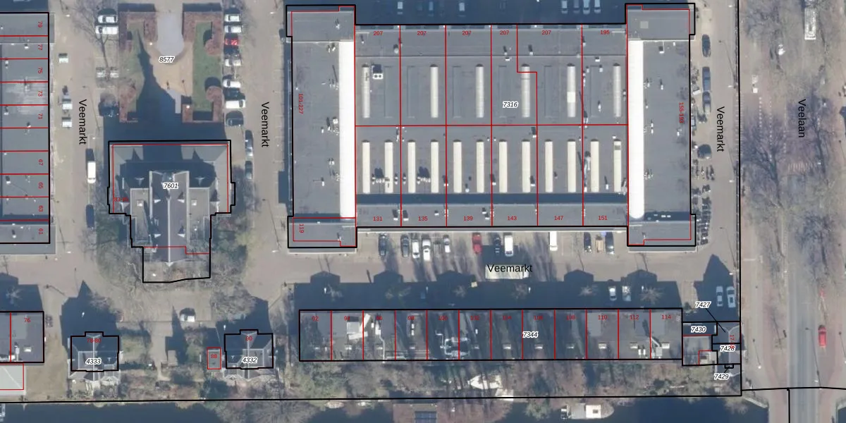 Het perceel waarop Veemarkt 135 staat heeft een oppervlakte van 4822 m². Dit is een zeer groot perceel. De perceeloppervlakte wordt geregistreerd door het Kadaster. Gedetailleerde informatie over de maten van dit perceel kunt u vinden in het rapport Kadastrale kaart met maatvoering van Veemarkt 135.