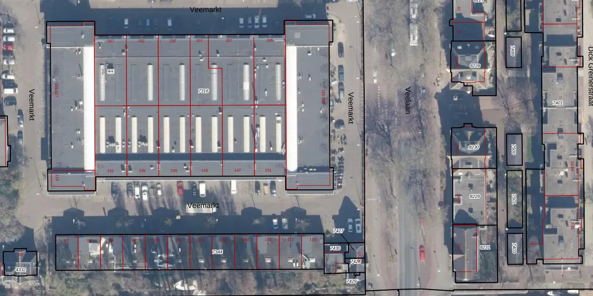 Het perceel waarop Veemarkt 159 staat heeft een oppervlakte van 4822 m². Dit is een zeer groot perceel. De perceeloppervlakte wordt geregistreerd door het Kadaster. Gedetailleerde informatie over de maten van dit perceel kunt u vinden in het rapport Kadastrale kaart met maatvoering van Veemarkt 159.