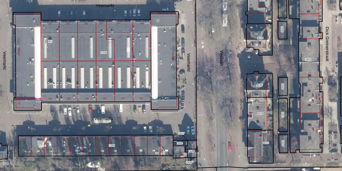 Het perceel waarop Veemarkt 169 staat heeft een oppervlakte van 4822 m². Dit is een zeer groot perceel. De perceeloppervlakte wordt geregistreerd door het Kadaster. Gedetailleerde informatie over de maten van dit perceel kunt u vinden in het rapport Kadastrale kaart met maatvoering van Veemarkt 169.