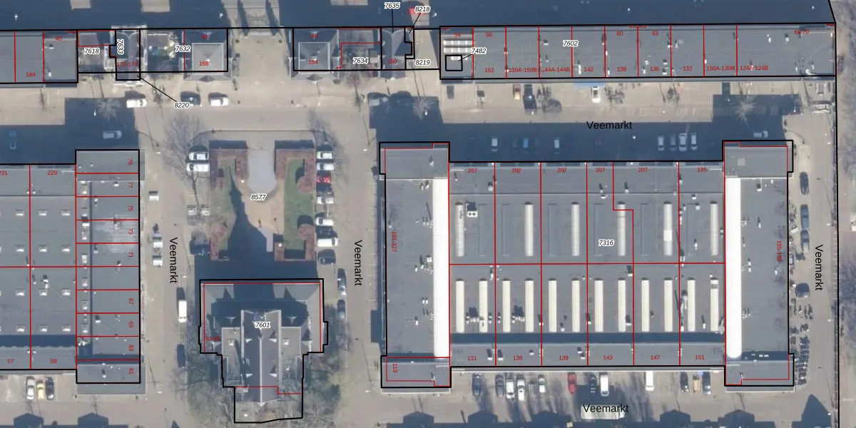 Het perceel waarop Veemarkt 225 staat heeft een oppervlakte van 4822 m². Dit is een zeer groot perceel. De perceeloppervlakte wordt geregistreerd door het Kadaster. Gedetailleerde informatie over de maten van dit perceel kunt u vinden in het rapport Kadastrale kaart met maatvoering van Veemarkt 225.