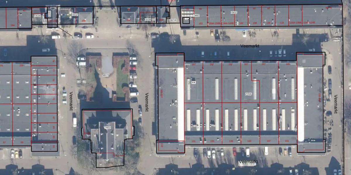 Het perceel waarop Veemarkt 227 staat heeft een oppervlakte van 4822 m². Dit is een zeer groot perceel. De perceeloppervlakte wordt geregistreerd door het Kadaster. Gedetailleerde informatie over de maten van dit perceel kunt u vinden in het rapport Kadastrale kaart met maatvoering van Veemarkt 227.