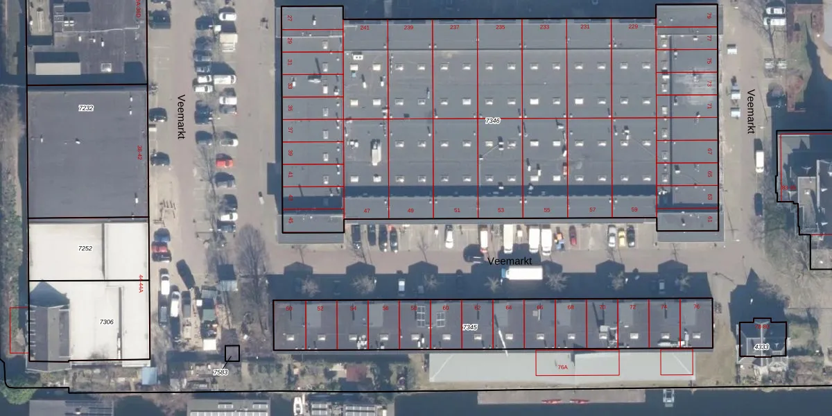 Het perceel waarop Veemarkt 49 staat heeft een oppervlakte van 5214 m². Dit is een zeer groot perceel. De perceeloppervlakte wordt geregistreerd door het Kadaster. Gedetailleerde informatie over de maten van dit perceel kunt u vinden in het rapport Kadastrale kaart met maatvoering van Veemarkt 49.