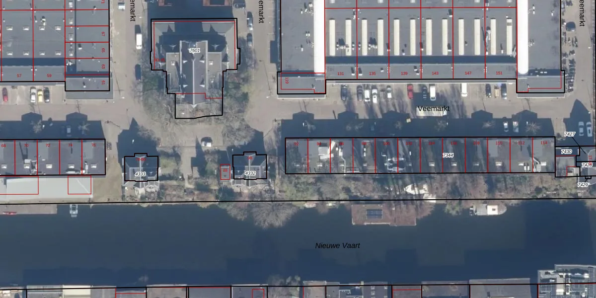 Het perceel waarop Veemarkt 92 staat heeft een oppervlakte van 1087 m². Dit is een zeer groot perceel. De perceeloppervlakte wordt geregistreerd door het Kadaster. Gedetailleerde informatie over de maten van dit perceel kunt u vinden in het rapport Kadastrale kaart met maatvoering van Veemarkt 92.