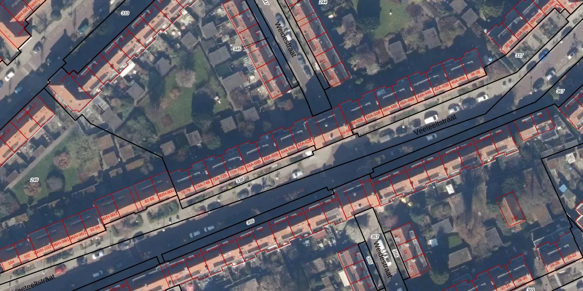 Het perceel waarop Veeteeltstraat 64-B staat heeft een oppervlakte van 1,1 ha. Dit is een zeer groot perceel. De perceeloppervlakte wordt geregistreerd door het Kadaster. Gedetailleerde informatie over de maten van dit perceel kunt u vinden in het rapport Kadastrale kaart met maatvoering van Veeteeltstraat 64-B.