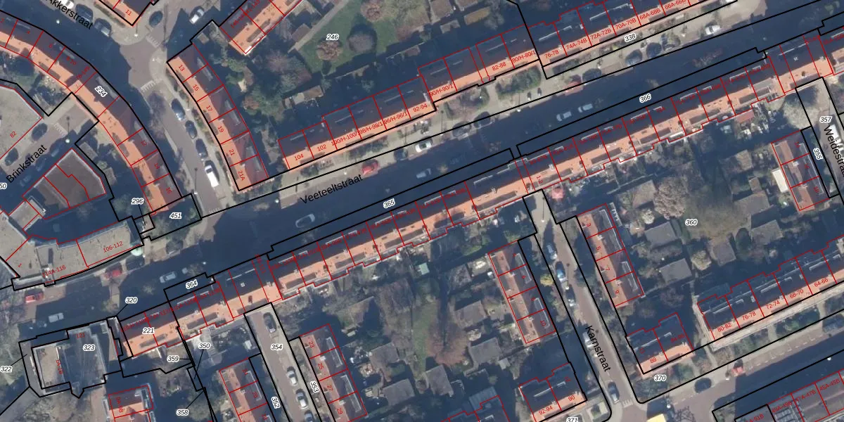 Het perceel waarop Veeteeltstraat 91-A staat heeft een oppervlakte van 1,3 ha. Dit is een zeer groot perceel. De perceeloppervlakte wordt geregistreerd door het Kadaster. Gedetailleerde informatie over de maten van dit perceel kunt u vinden in het rapport Kadastrale kaart met maatvoering van Veeteeltstraat 91-A.
