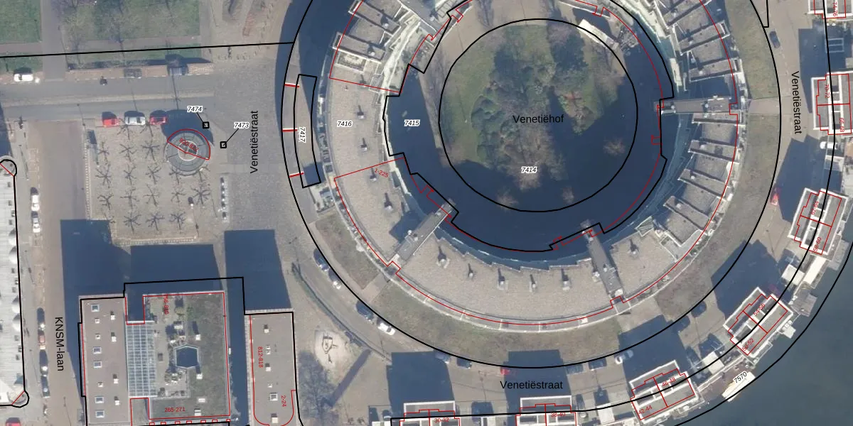 Het perceel waarop Venetiëhof 192 staat heeft een oppervlakte van 7719 m². Dit is een zeer groot perceel. De perceeloppervlakte wordt geregistreerd door het Kadaster. Gedetailleerde informatie over de maten van dit perceel kunt u vinden in het rapport Kadastrale kaart met maatvoering van Venetiëhof 192.