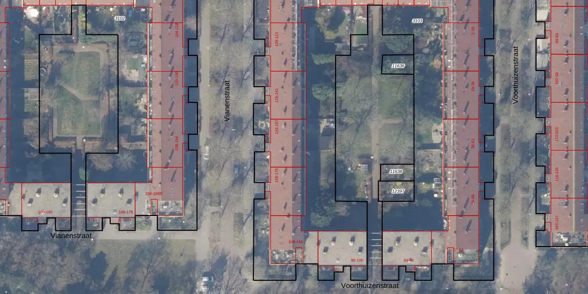 Het perceel waarop Vianenstraat 151 staat heeft een oppervlakte van 6682 m². Dit is een zeer groot perceel. De perceeloppervlakte wordt geregistreerd door het Kadaster. Gedetailleerde informatie over de maten van dit perceel kunt u vinden in het rapport Kadastrale kaart met maatvoering van Vianenstraat 151.