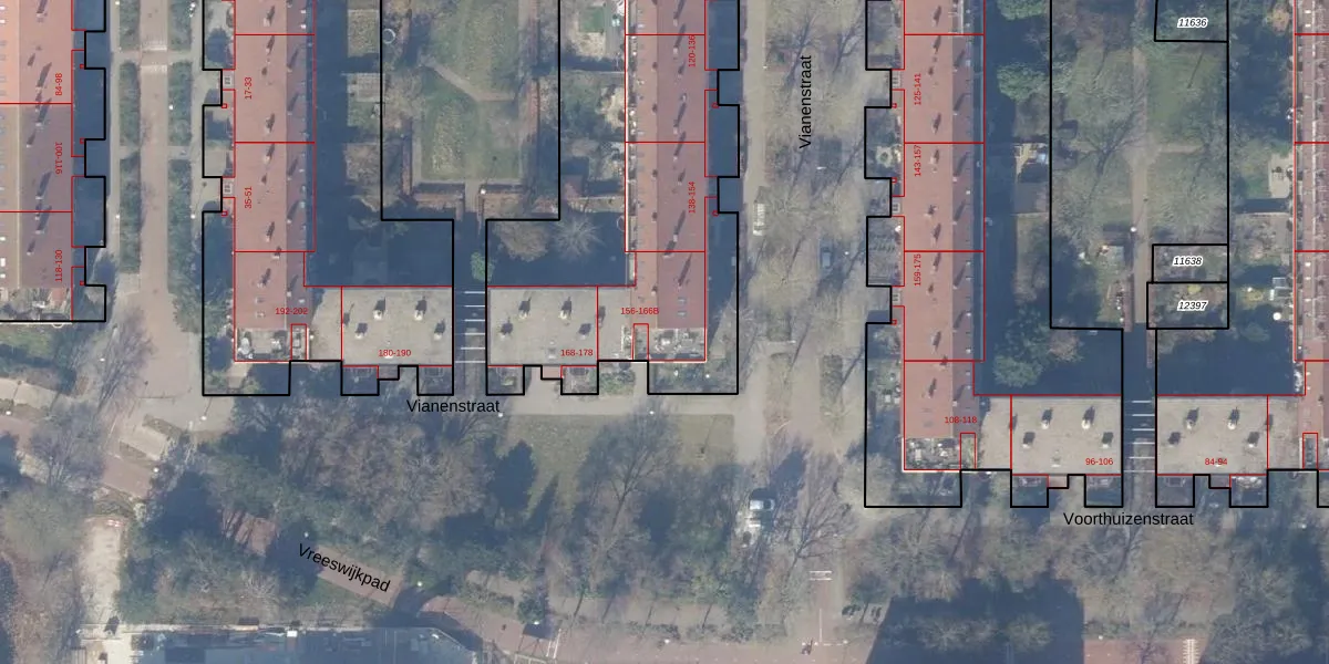 Het perceel waarop Vianenstraat 162 staat heeft een oppervlakte van 5721 m². Dit is een zeer groot perceel. De perceeloppervlakte wordt geregistreerd door het Kadaster. Gedetailleerde informatie over de maten van dit perceel kunt u vinden in het rapport Kadastrale kaart met maatvoering van Vianenstraat 162.
