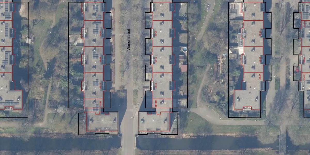 Het perceel waarop Vianenstraat 67 staat heeft een oppervlakte van 6372 m². Dit is een zeer groot perceel. De perceeloppervlakte wordt geregistreerd door het Kadaster. Gedetailleerde informatie over de maten van dit perceel kunt u vinden in het rapport Kadastrale kaart met maatvoering van Vianenstraat 67.