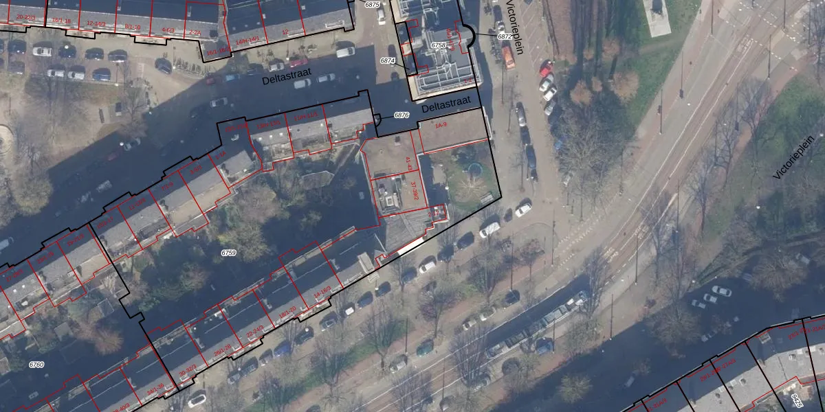 Het perceel waarop Victorieplein 37 staat heeft een oppervlakte van 3845 m². Dit is een zeer groot perceel. De perceeloppervlakte wordt geregistreerd door het Kadaster. Gedetailleerde informatie over de maten van dit perceel kunt u vinden in het rapport Kadastrale kaart met maatvoering van Victorieplein 37.