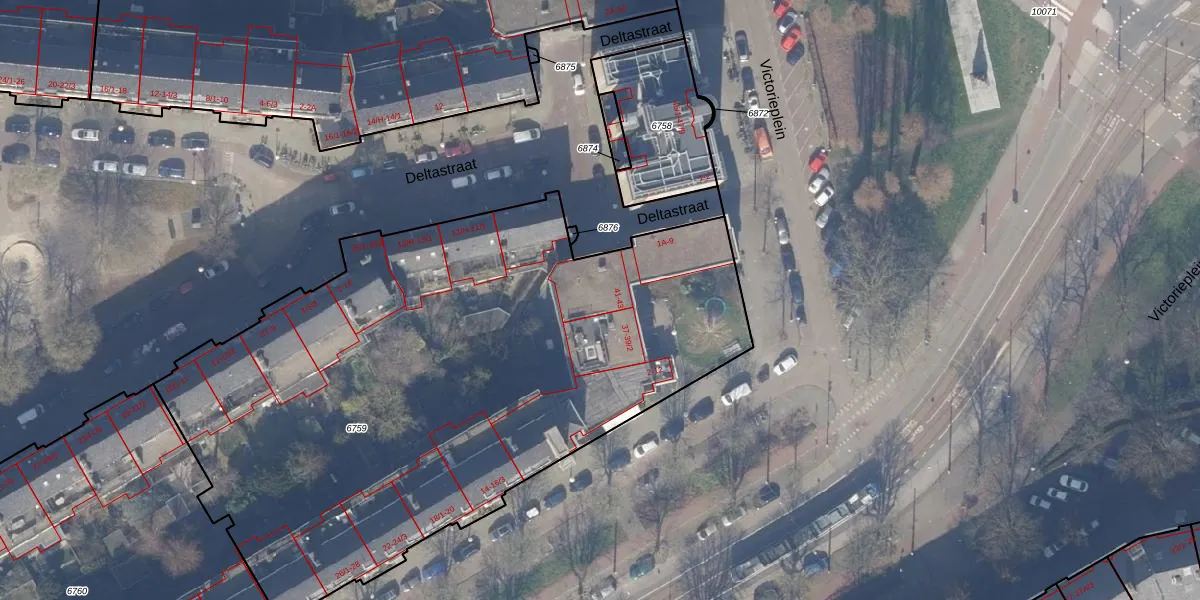Het perceel waarop Victorieplein 41 staat heeft een oppervlakte van 3845 m². Dit is een zeer groot perceel. De perceeloppervlakte wordt geregistreerd door het Kadaster. Gedetailleerde informatie over de maten van dit perceel kunt u vinden in het rapport Kadastrale kaart met maatvoering van Victorieplein 41.