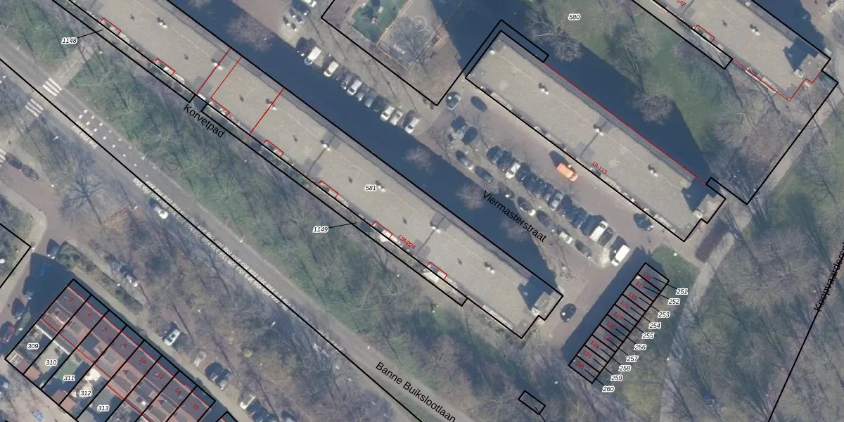 Het perceel waarop Viermasterstraat 134 staat heeft een oppervlakte van 2280 m². Dit is een zeer groot perceel. De perceeloppervlakte wordt geregistreerd door het Kadaster. Gedetailleerde informatie over de maten van dit perceel kunt u vinden in het rapport Kadastrale kaart met maatvoering van Viermasterstraat 134.