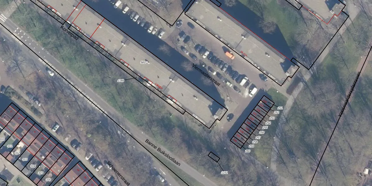 Het perceel waarop Viermasterstraat 142 staat heeft een oppervlakte van 2280 m². Dit is een zeer groot perceel. De perceeloppervlakte wordt geregistreerd door het Kadaster. Gedetailleerde informatie over de maten van dit perceel kunt u vinden in het rapport Kadastrale kaart met maatvoering van Viermasterstraat 142.